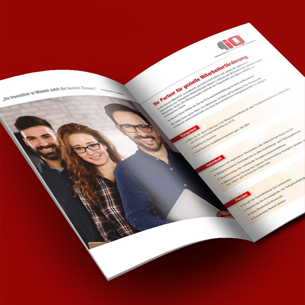Wir entwickeln und produzieren für IQ Wissen jede Menge Werbemittel, die von der Geschäftsausstattung über diverse Broschüren, Poster, Handzettel, Flyer und Anzeigen bis hin zur Fensterbeklebung reichen. Und das von der Idee bis zur Druckvorstufe. Online liefern wir regelmäßig Landingpages für aktuelle Themen.
